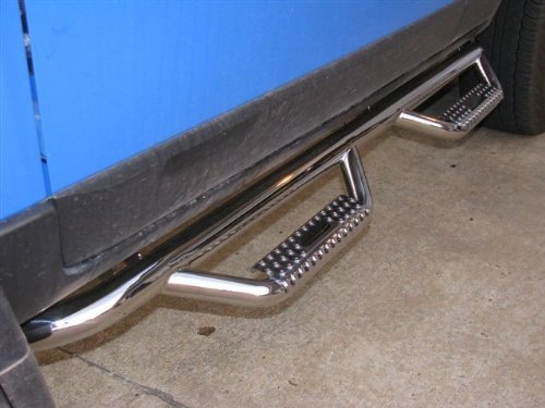 #Ideal for high-profile and lifted pickups, the patented step hoop design features drop-down steps with welded step pads on a full 3" tube for rugged durability. Welded, one-piece units for fast, easy installation. That construction gives them a 445-lb. weight rating (highest in the industry). Custom fit to the vehicle with the main bar built high and tight to hide the vehicle fRAM and provide better protection from road debris. Full-length four-step design extends from the front wheel to the rear wheel for a long, sleek look with a savings. Made from 304 polished stainless steel for superior resistance to corrosion. Made in USA. Available: Extended cab Crew cab